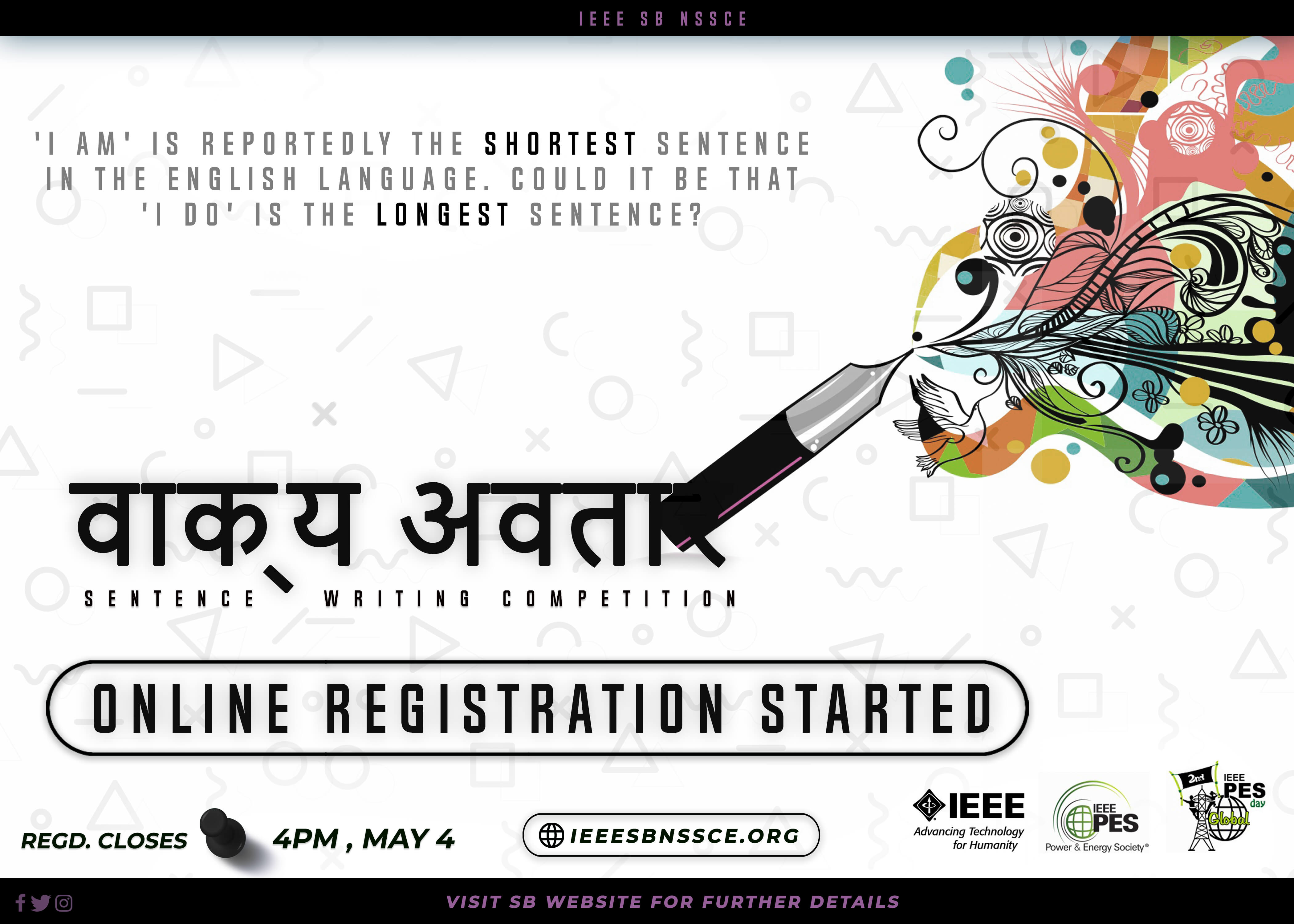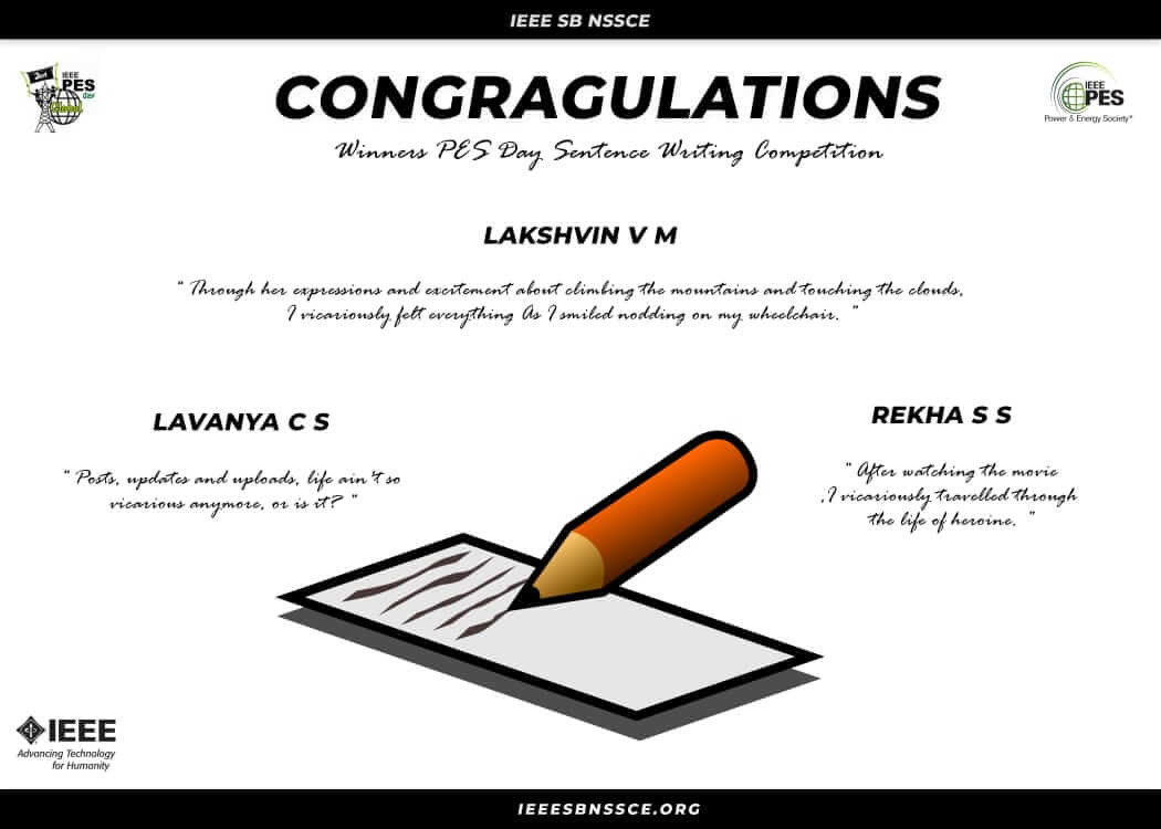 IEEE PES SBC NSSCE conducted an online Sentence Writing Competition on the word vicarious in association with PES Day Celebration. The competition was open to all in Kerala, irrespective fo their qaulifications. The best 3 sentence made with the word vicarious were selected and awarded as winners.